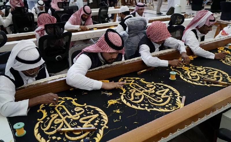 – مرحلة تجميع وخياطة الثوب: في المرحلة قبل الأخيرة يتم تجميع القماش المنقوش وتثبيت الآيات المذهبات عليها، ويتم تجميع ستارة باب الكعبة المشرفة.