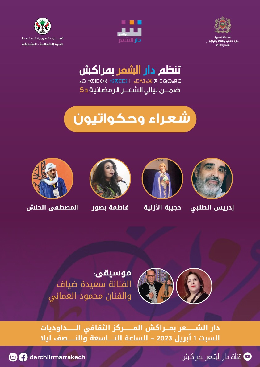 تفتتح دار الشعر بمراكش الليالي الشعرية الخامسة الرمضانية، يوم السبت 1 ابريل 2023 على الساعة التاسعة والنصف ليلا بفضاء المركز الثقافي الداوديات بمراكش، بفقرة جديدة من برنامجها الثقافي “شعراء وحكواتيون”. وتشهد هذه الأمسية، الشعرية والفنية، مشاركة الشعراء والفنانين: ادريس الطلبي وفاطمة بصور والحكواتيان حجيبة الأزلية ومصطفى الشليح، الى جانب المشاركة المتميزة للفنانة سعيدة ضياف والعازف محمود العماني، في تواشج لأنماط القول الابداعي وفي تناغم تام مع القصيدة وتعبيراتها الفنية.