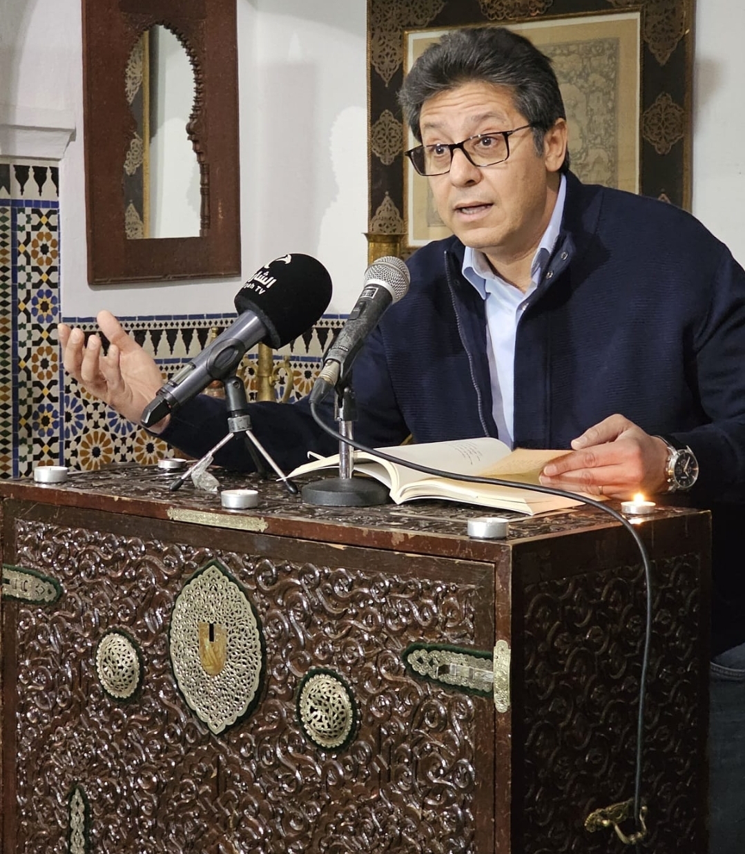 وافتتح مخلص الصغير، دير دار الشعر بتطوان، هذه التظاهرة، معلنا عودة دار الشعر إلى مدينتها تطوان، بعد سلسلة من اللقاءات التي أقامتها الدار في فاس ومكناس والحسيمة وتاونات وطنجة، خلال الشهر الماضي، احتفاء بالسنة الأمازيغية، وضمن فعاليات ثقافية أخرى. من جانبه، نوه المدير الإقليمي للثقافة بتطوان الأستاذ العربي المصباحي بالعمق الثقافي لمدينة تطوان، وانشغال أهلها بالثقافة والفن والشعر، مستشهدا بدار الشعر، التي تقيم فعالياتها في تطوان، وباقي المدن المغربية، وهي تستضيف مختلف الأصوات الشعرية المغربية الخلاقة والمبدعة. كما رحب المصباحي بالحضور الذي توافد بكثافة وأناقة على فضاء مدرسة الصنائع والفنون الوطنية، بطابعها الأندلسي المغربي، وبدائعها وتحفها التي أبدعها كبار المعلمين الذين مروا من هذه المؤسسة التي شيدت منذ أزيد من قرن.