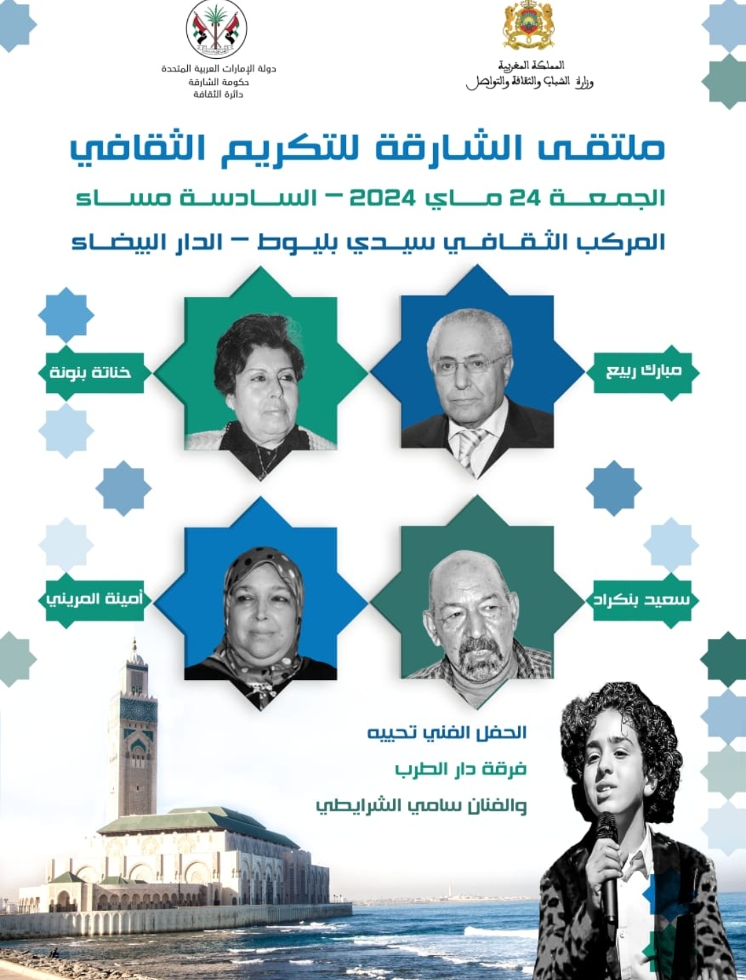 بتعاون مع وزارة الشباب والثقافة والتواصل في المملكة المغربية، تكرم دائرة الثقافة في حكومة الشارقة أربعة من أعلام وعلامات الثقافة المغربية، ضمن فعاليات الدورة 18 من ملتقى الشارقة للتكريم الثقافي، وذلك يوم الجمعة 24 ماي 2024، بالمركب الثقافي سيدي بليوط، بمدينة الدار البيضاء، ابتداء من الساعة السادسة مساء.