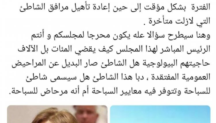 وهنا سيطرح سؤالا عله يكون محرجا لمجلسكم و أنتم الرئيس المباشر لهذا المجلس كيف يقضي المئات بل الآلاف حاجيتهم البيولوجية هل الشاطئ صار البديل عن المراحيض العمومية المفتقدة ، دبا هذا الشاطئ هل سيسمى شاطئ للسباحة وتتوفر فيه معايير السباحة أم أنه مرحاض للسباحة.