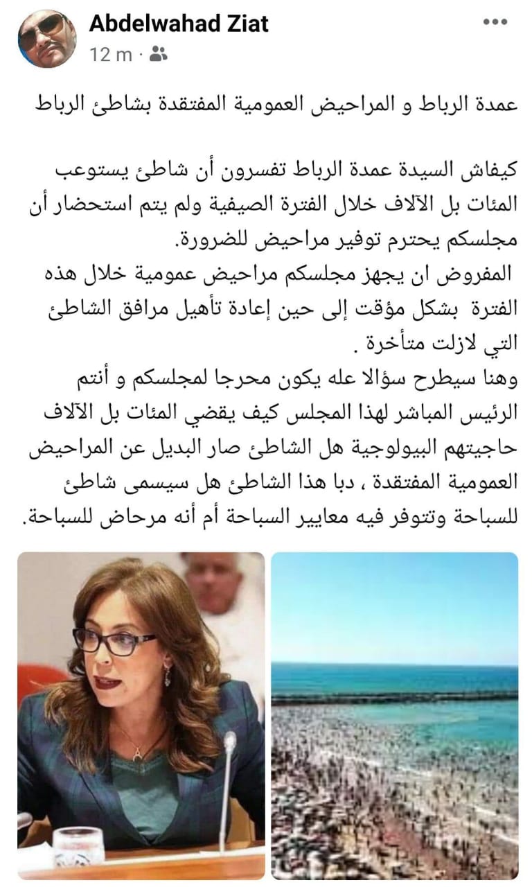 كيفاش السيدة عمدة الرباط تفسرون أن شاطئ يستوعب المئات بل الآلاف خلال الفترة الصيفية ولم يتم استحضار أن مجلسكم يحترام توفير مراحيض للضرورة.