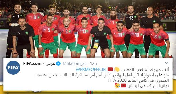 وهنأ الاتحاد الدولي لكرة القدم “الفيفا” المنتخب المغربي بالتأهل، وكتب في تدوينة عبر حسابه الرسمي على “تويتر” : “ألف مبروك لمنتخب المغرب ، فاز على أنجولا 4-0 وتأهل لنهائي كأس أمم أفريقيا لكرة الصالات ليلحق بشقيقه المصري في كأس العالم 2020 FIFA .. تهانينا ونراكم في ليتوانيا”.
