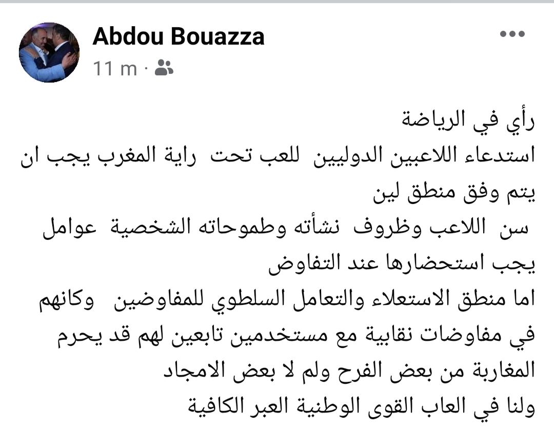 و في اتصال “سياسي” بصاحب التدوينة؛ قال برلماني إقليم شفشاون عبد الرحيم بوعزة” أن الشأن الكروي شأن يهم المغاربة عموما ولا يجب ان يخضع لمنطق شخصي محض..فجل مواقف المغاربة ترفض ابعاد بعض اللاعبين من قائمة المنتخب المغربي اذا يجب استحضار اراءهم في هذا الامر…خصوصا وان كرة القدم هي الرياضة الشعبية الاولى في المغرب وفي العالم”
