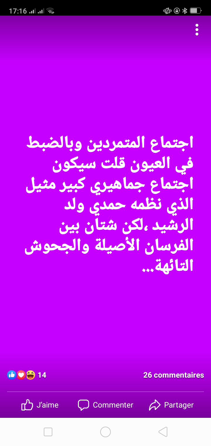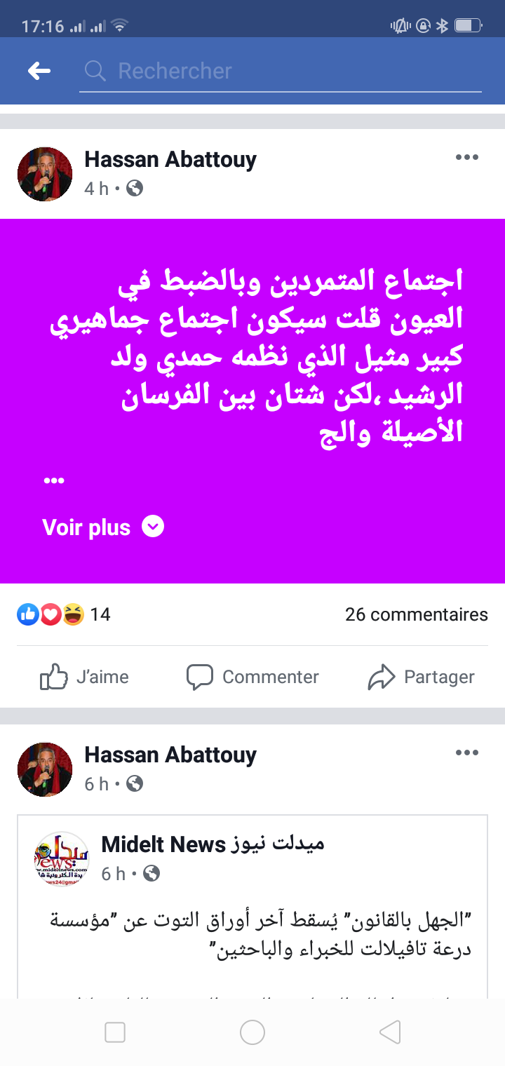عضو بالمكتب الفيدرالي للبام يصف المناضلين ب”الجحوش” سياسةصحتك بتاريخ يوليو 4, 2019 مشاركة وصف عضو المكتب الفدرالي لحزب الأصالة والمعاصرة أعضاء حزبه في تيار المستقبل بوصف غريب كتبه في تدوينة.. “اجتماع المتمردين وبالضبط في العيون قلت سيكون اجتماع جماهيري كبير مثيل الذي نظمه حمدي ولد الرشيد ،لكن شتان بين الفرسان الأصيلة والجحوش التائهة…” Facebook Twitter WhatsApp الأصالة والمعاصرةالبام