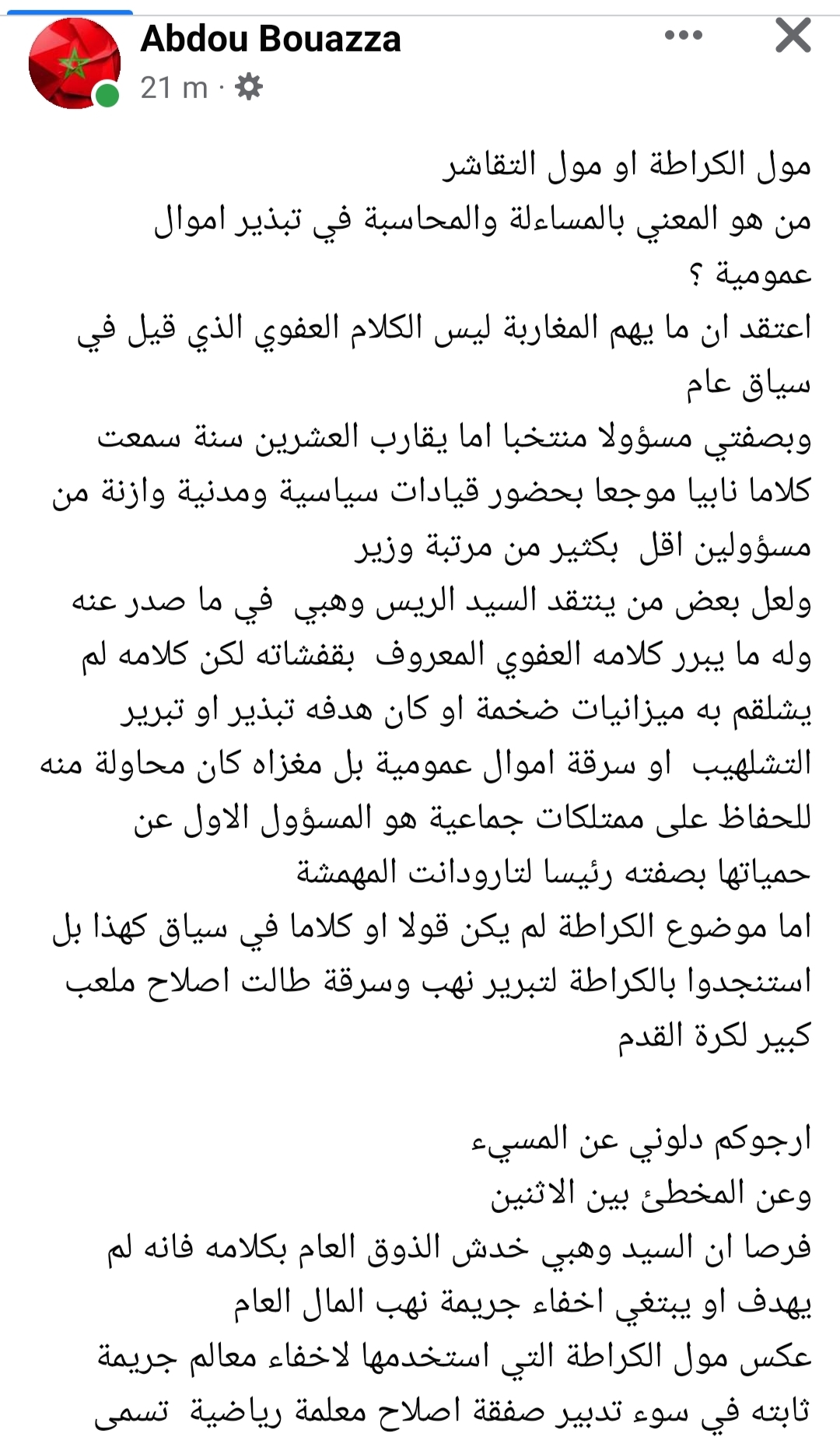 اما موضوع الكراطة لم يكن قولا او كلاما في سياق كهذا بل استنجدوا بالكراطة لتبرير نهب وسرقة طالت اصلاح ملعب كبير لكرة القدم