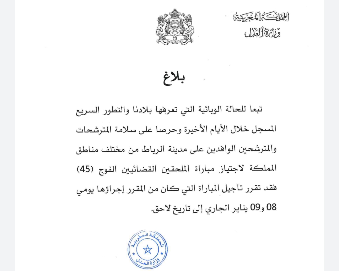 وزارة العدل تعلن عن تأجيل مباراة الملحقين القضائيين مجتمع بتاريخ يناير 6, 2022 مشاركة أعلنت وزارة العدل في بلاغ توصلت به “سياسي”؛ انه نظرا للحالة الوبائية لكوفيد 19 فقد تقرر تأجيل مباراة الملحقين القضائيين التي كانت سوف تجرى يومي 8 و9 يناير الى وقت لاحق. Facebook Twitter WhatsApp