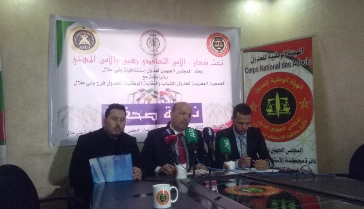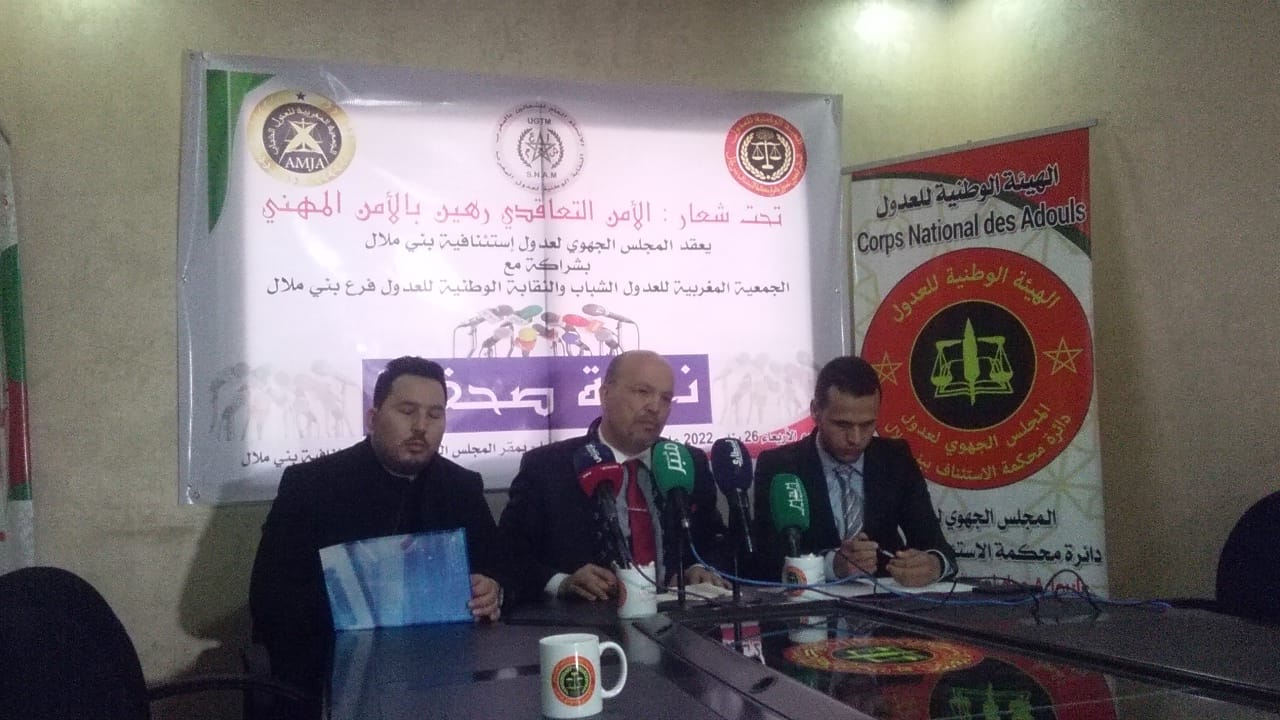 عقد المجلس الجهوي لعدول دائرة محكمة الاستئناف ببني ملال بشراكة مع الفرع الجهوي للجمعية المغربية للعدول الشباب ببني ملال ،والفرع الجهوي للنقابة الوطنية للعدول بني ملال ندوة صحفية تحت شعار” الأمن التعاقدي رهين بالأمن بالمهني “، وذلك بحضور إدريس الطرالي رئيس المجلس الجهوي لعدوا دائرة محكمة الاستئناف ببني ملال ،حمزة بنعدي رئيس الفرع الجهوي للعدول الشباب ببني ملال ومحمد بنحدو رئيس النقابة الوطنية للعدول ببني ملال.