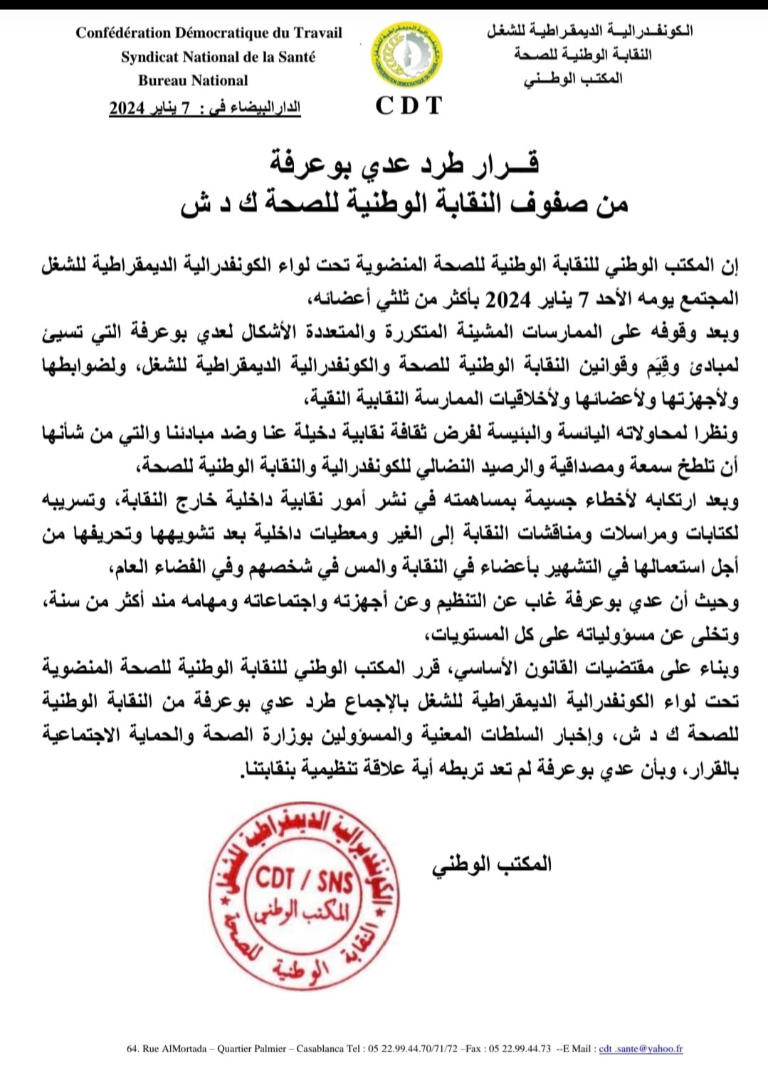 اصدر المكتب الوطني للنقابة الوطنية للصحة المنضوية تحت لواء الكونفدرالية للشغل، قرار طرد القيادي في صفوفها عدي بوعرفة ، حسب قرار اطلعت عليه” سياسي“.