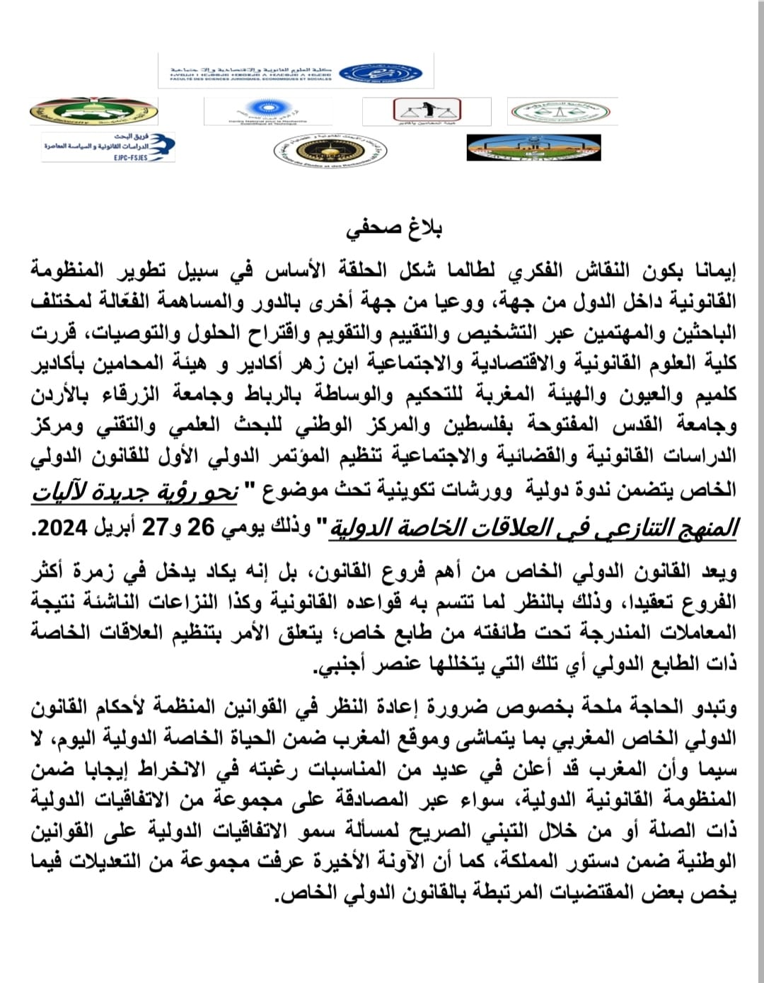 إيمانا بكون النقاش الفكري لطالما شكل الحلقة الأساس في سبيل تطوير المنظومة القانونية داخل الدول من جهة، ووعيا من جهة أخرى بالدور والمساهمة الفعّالة لمختلف الباحثين والمهتمين عبر التشخيص والتقييم والتقويم واقتراح الحلول والتوصيات، نظمت كلية العلوم القانونية والاقتصادية والاجتماعية ابن زهر أكادير و هيئة المحامين بأكادير كلميم والعيون والهيئة المغربة للتحكيم والوساطة بالرباط وجامعة الزرقاء بالأردن وجامعة القدس المفتوحة بفلسطين والمركز الوطني للبحث العلمي والتقني ومركز الدراسات القانونية والقضائية والاجتماعية تنظيم المؤتمر الدولي الأول للقانون الدولي الخاص يتضمن ندوة دولية وورشات تكوينية تحث موضوع ” نحو رؤية جديدة لآليات المنهج التنازعي في العلاقات الخاصة الدولية” وذلك يومي 26 و27 أبريل 2024.