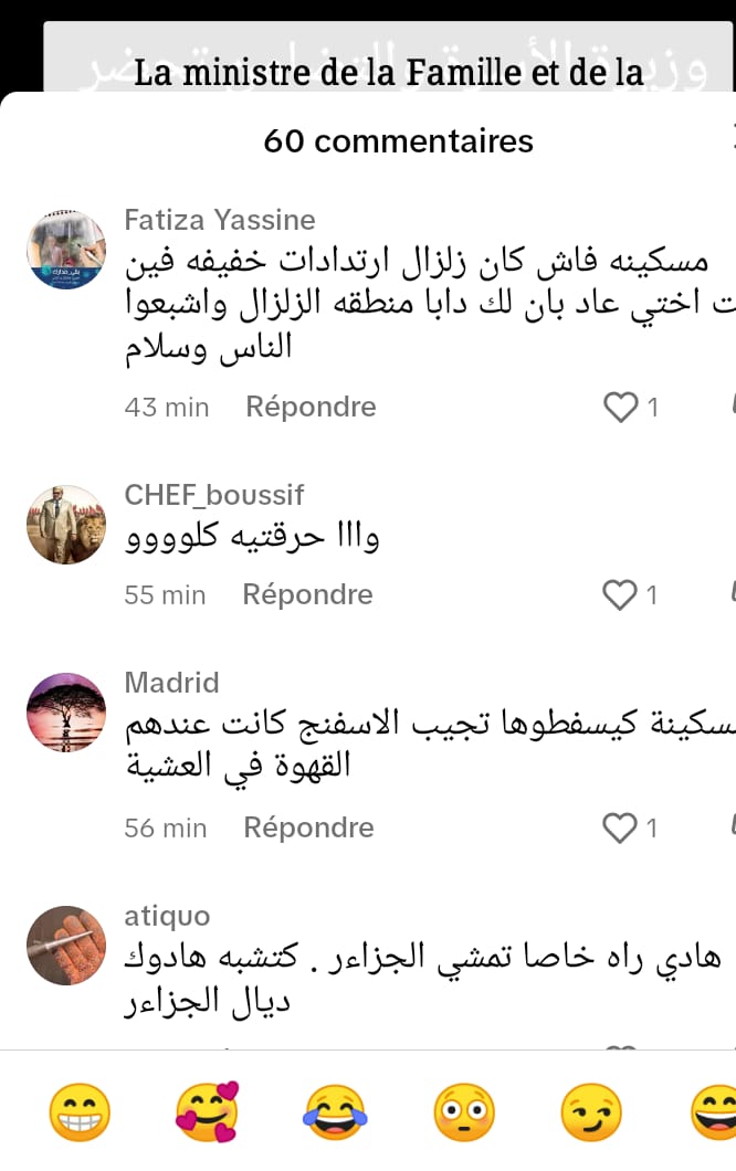 دون احترام للموقف ولمشاعر الساكنة التي لا زالت تحت هول الصدمة وتنتظر فصل الشتاء بتخوف كبير رغم التضامن الكبير الذي عبر عنه المغارية والجهود الجبارة للسلطات العمومية منذ الأيام الأولى لوقوع الفاجعة لتظهر الوزيرة بعد اسبوعين بشكل مثير للغاية.