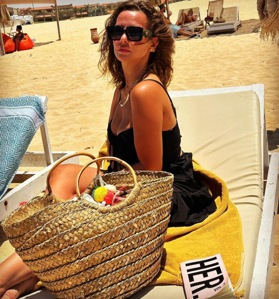 وظهرت إيمان العاصي بالصور بمايوه باللون الأسود مكشوف الصدر، ومن الناحية الجمالية لم تضع المكياج واعتمدت على الشعر الكيرلي وتركته منسدلاً على كتفيها.
