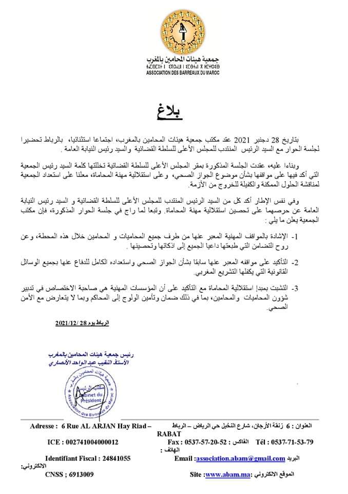 المحامون يرجعون للترافع في المحاكم احتراما للأمن الصحي أراء وقضايامجتمع آخر تحديث يناير 12, 2022 مشاركة عقدت جمعية هيئات المحامين جلسة حوار مع الرئيس المنتدب للسلطة القضائية و رئيس النيابة العامة بخصوص الجدل الذي صاحب فرض جواز التلقيح لدخول المحاكم.. واصدرت هيئات المحامين بلاغ التالي: Facebook Twitter WhatsApp