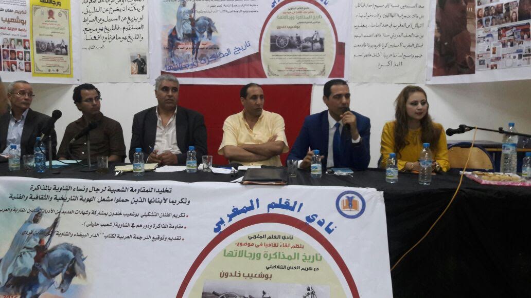 في سياق الإعلاء من الهوية التاريخية للمغاربة وإبراز قيمها الكبرى التي ساهمت في بناء تاريخنا، وهو ما دأب عليه نادي القلم المغربي في جزء من تصوره للعمل الثقافي الميداني، كان الموعد مع قبائل المذاكرة بمدينة الكارة يوم السبت 21 ماي 2016 بالخزانة البلدية التي غصت عن آخرها بجمهور من كل الأجيال ومن مدن متعددة: ( الكارة وعدد من الجماعات القروية،الدار البيضاء، سلا، المحمدية، بنسليمان، برشيد، الدروة،سطات،ابن أحمد..) لحضور لقاء تخليد قيم المقاومة الشعبية لرجال ونساء الشاوية بالمذاكرة، وتكريما لأبنائها الذين حملوا مشعل الثقافة والفن.وقد التأم هذا الحفل بتنسيق مع جمعية المهاجر للأعمال الاجتماعية بالكارة والمركز العالمي للفنون التشكيلية فرع المغرب العربي والمركز المغربي البرازيلي وبتعاون مع المجلس البلدي لمدينة الكارة، حيث افتتح عبد الرحمان غانمي بكلمة عن أسباب انعقاده .ثم تدخل في هذا الفقرة الافتتاحية بعد قراءة الفاتحة على الشهداء بوزيد فخر الدين رئيس جمعية المهاجر للأعمال الاجتماعية بالكارة ومحمد فطين وعبد الرحيم بلحمرة ممثل عن المجتمع المدني والحاج عمر الكنوني بالإضافة إلى كلمة نائب رئيس المجلس البلدي للكارة والتي أجمعت كلها على نبل الفعل الثقافي حينما يرتبط بالتاريخ والمستقبل للنهوض بالمدن الصغرى والبادية المغربية التي ساهمت في بناء المغرب على مر التاريخ.