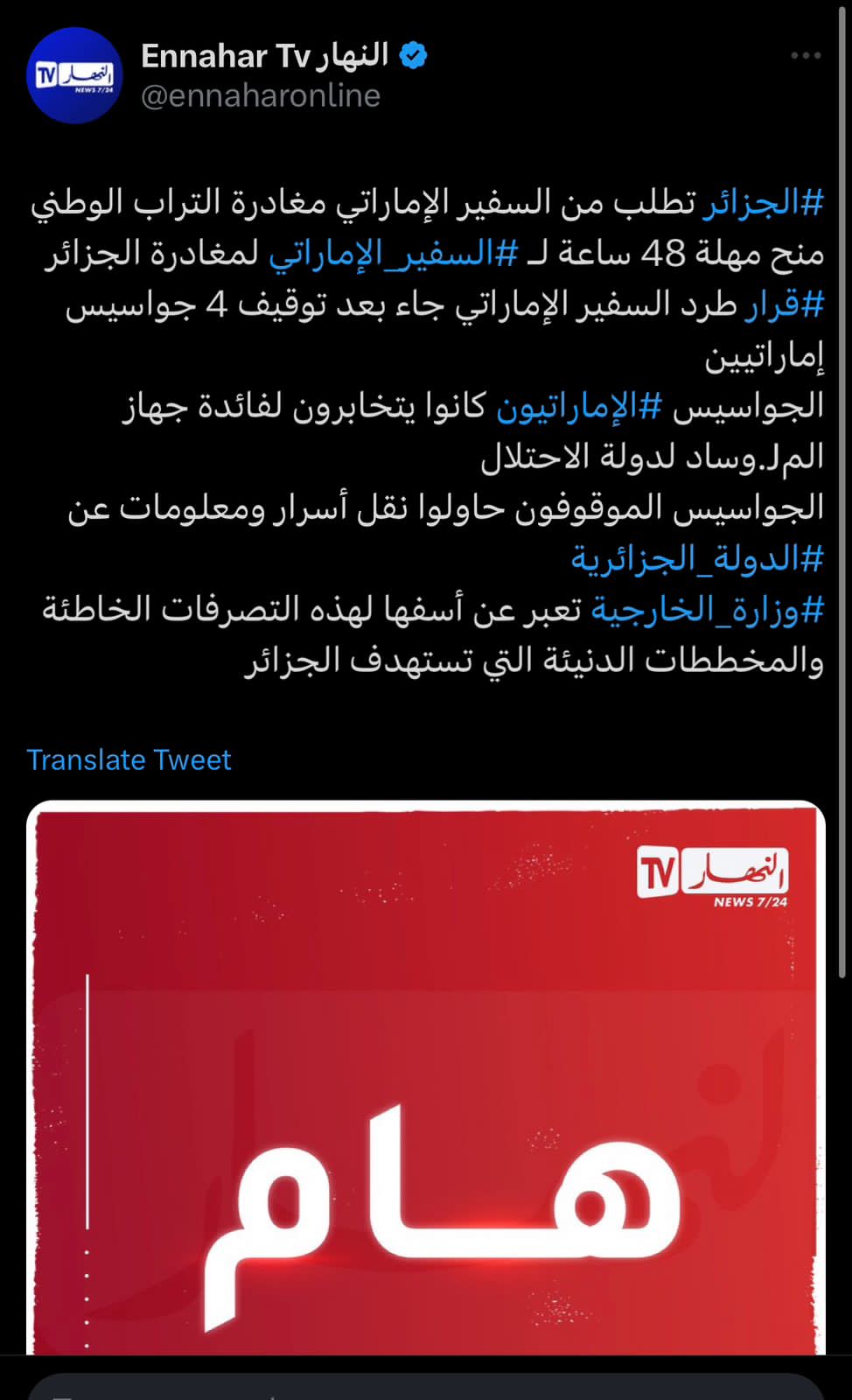 ارتباك وضاح وهو سيد الموقف، بعد ان نشرت جريدة النهار الجزائرية ليلة امس خبر قالت فيه ”  إن السلطات الجزائرية  قامت بطرد السفير الإماراتي في الجزائر”…ليتم حذف هبر ساعات بعد نشره.