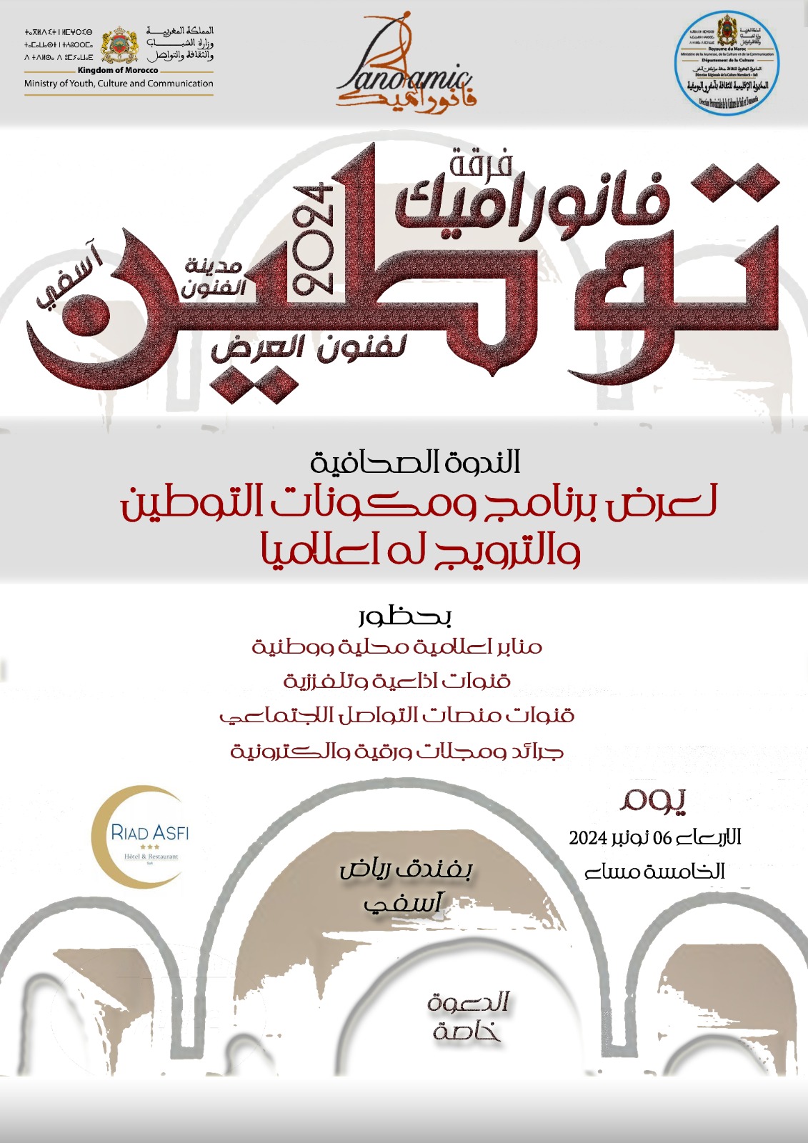 بدعم من وزارة الشباب والثقافة والتواصل، قطاع الثقافة، وفي إطار دعم توطين الفرق المسرحية بالمسارح الوطنية، تنظم فرقة فانوراميك لفنون العرض خلال أيام: 6-7-8-9-10 نونبر من السنة الجارية، برنامجا فنيا وثقافيا غنيا بحاضرة المحيط أسفي. وتشهد هذه البرمجة الجديدة لفانوراميك، تنظيم أيام فنية تشمل ندوات ولقاءات وعروض وتوقيات ومحاضرات وتقديم لماستر كلاس، وبمشاركة وازنة لوجوه فنية وثقافية، كما يتم إطلاق هذا البرنامج الغني بتزامن مع الاحتفاء بعيد المسيرة الخضراء، المناسبة الغالية على قلوب المغاربة.
