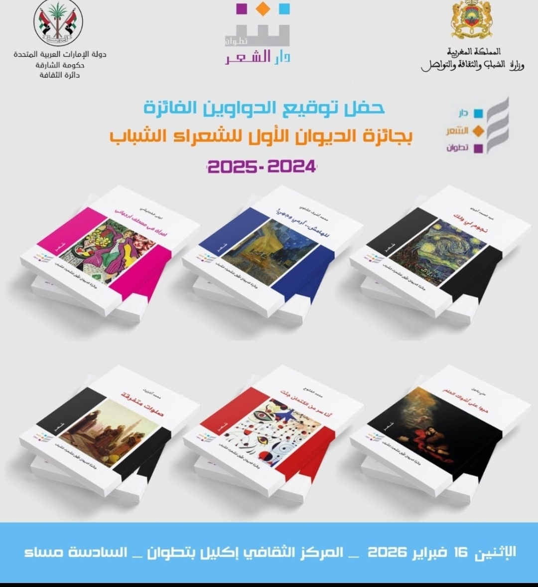 تنظم دار الشعر في تطوان حفل تقديم وتوقيع الأعمال الشعرية الفائزة بجائزة الديوان الأول للشعراء الشباب، وذلك يوم الإثنين 16 فبراير الجاري، في فضاء المركز الثقافي إكليل بمدينة تطوان، ابتداء من الساعة السادسة مساء.
