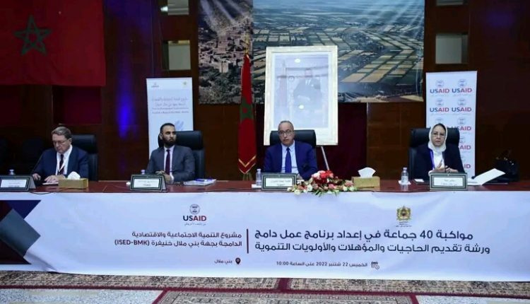 وبعد مرور 8 أشهر من المواكبة الميدانية لإعداد برنامج عمل الجماعة، تم تحت اشراف ولاية جهة بني ملال خنيفرة تنظيم ورشة تفاعلية لتدارس الحاجيات والأولويات التنموية لـ 40 جماعة بجهة بني ملال خنيفرة التي تحظى بدعم مشروع التنمية الاجتماعية والاقتصادية الدامجة لجهة بني ملال خنيفرة الممول من طرف الوكالة الامريكية للتنمية الدولية ، الخميس 22 شتنبر 2022 بمقر ولاية الجهة، وشهدت هذه الورشة مشاركة ولاية جهة بني ملال – خنيفرة ممثلة بالكتابة العامة للشؤون الجهوية لجهة بني ملال خنيفرة وممثل مجلس جهة بني ملال خنيفرة وممثل الوكالة الامريكية للتنمية الدولية وممثل المركز الجهوي للاستثمار وممثلي مجالس الأقاليم الخمس وممثلي اقسام الجماعات المحلية بعمالات أقاليم الجهة ورئيستي ورؤساء الجماعات المعنية.