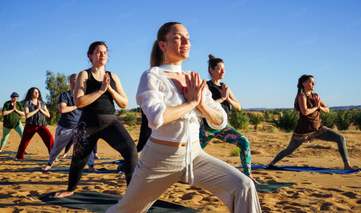 تتقدم لورا وكاتيا، وهما سائحتان ألمانيتان تقيمان بهذا المخيم المطل على التلال الرملية، في هدوء للالتحاق بمجموعة تضم حوالي عشرين من عشاق هذه الممارسة الروحية، قصد الاستمتاع بلحظات من الاسترخاء والهدوء وإعادة الاتصال بالذات.