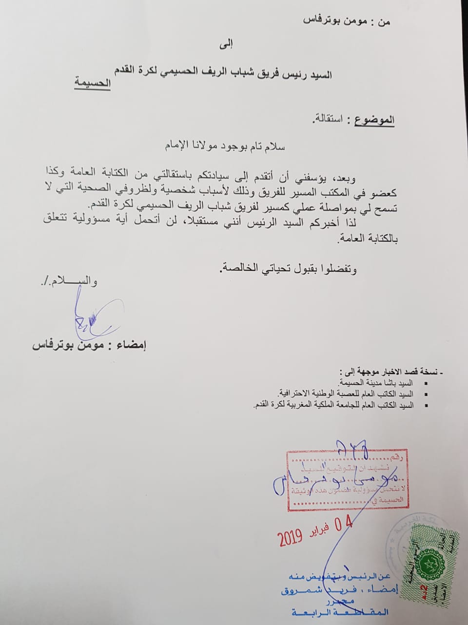 نسخة موجهة إلى رئيس جمعية شباب الريف الحسيمي لكرة القدم.
