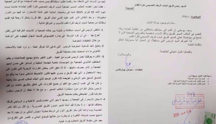 بالوثائق : المكتب المسير لفريق شباب الريف الحسيمي يقدم إستقالة جماعية !