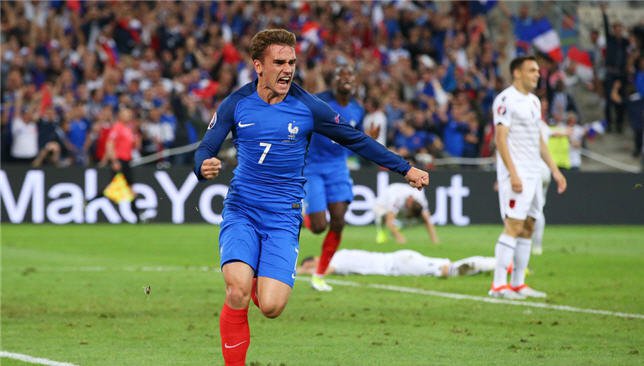 وجاء الهدف الاول في الوقت المحتسب بدل الضائع للشوط الاول بعدما احتسب الحكم الايطالي نيكولا ريتسولي لمسة يد على باستيان شفاينشتايجر في المنطقة اثناء التحام في الهواء مع باتريس ايفرا لينفذها جريزمان هداف البطولة بنجاح.