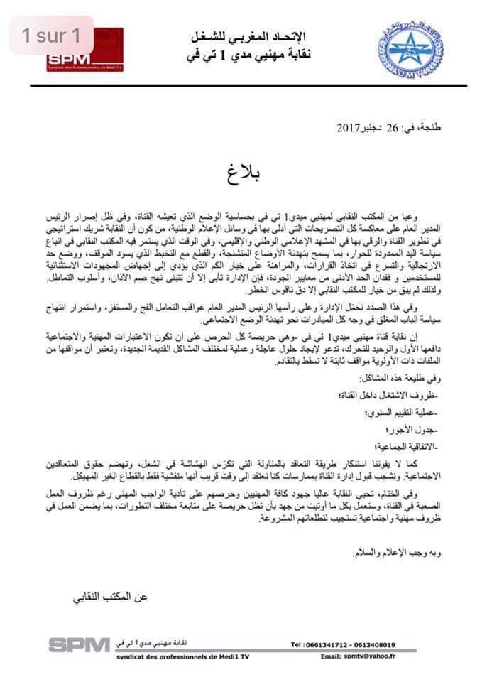 واستغرب المكتب النقابي لمهني قناة ميدي 1 تيفي اصرار المدير العام في ” التعامل الفج والمستفز واستمرار سياسة الباب المغلق.. عكس ما قاله في تصريحات للصحافة في كون النقابة شريك استراتيجي..”