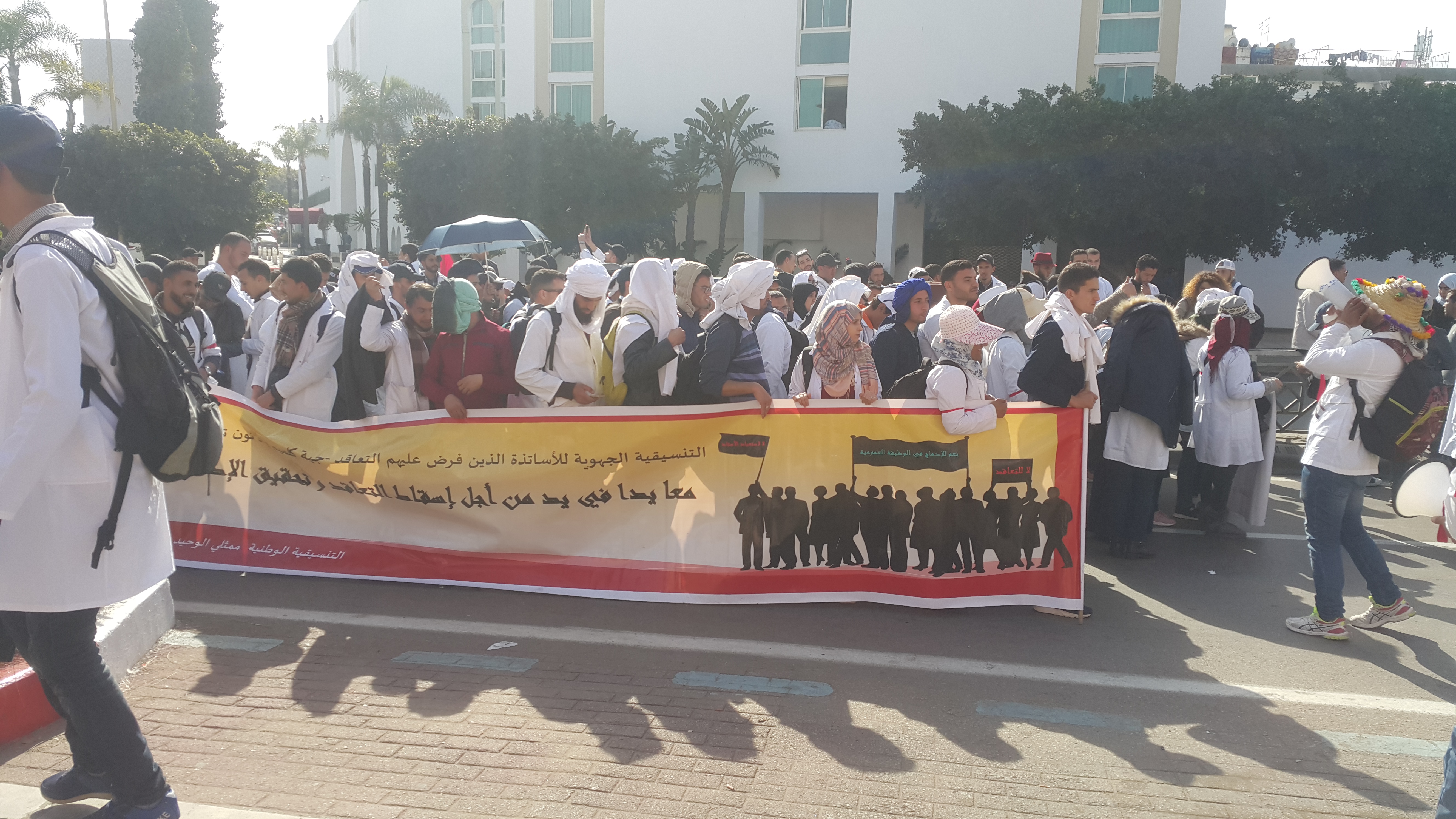 ورفض المحتجون سياسة التعاقد التي تنهجها وزارة التربية الوطنية مع الأساتذة المتدربين والمتعاقدين