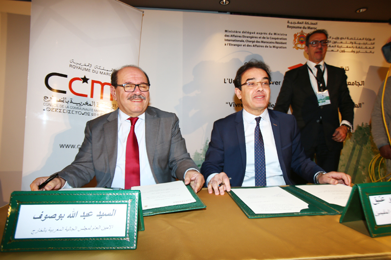 وقع الوزير المنتدب لدى وزير الشؤون الخارجية والتعاون الدولي المكلف بالمغاربة المقيمين بالخارج وشؤون الهجرة رفقة عبد الله بوصوف الأمين العام لمجلس الجالية المغربية بالخارج يوم الجمعة 22 دجنبر 2017 بجامعة الأخوين على اتفاقية شراكة حول تكوين وتأهيل مغاربة العالم للدفاع عن قضية الصحراء المغربية.
