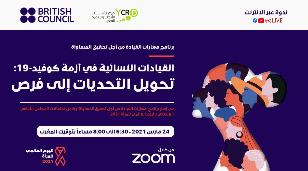 ينظم مركز الشباب للأبحاث والتنمية ندوة عامة عبر الانترنت يوم الأربعاء 24 مارس 2021 من الساعة السادسة والنصف حتى الساعة الثامنة مساءا (توقيت المغرب) تحت عنوان “القيادات النسائية في أزمة كوفيد 19: تحويل التحديات إلى فرص”