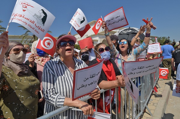 تظاهر مئات من مناصري الحزب الدستوري الحر (المناهض للإسلاميين) الأربعاء في العاصمة تونس للمطالبة برحيل رئيس البرلمان راشد الغنوشي، متّهمين إياه بتخطي صلاحياته.
