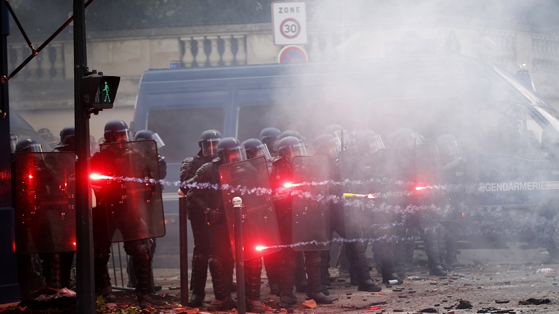 وعلى تويتر، أعادت إدارة الشرطة في باريس نشر مقطع مصور لمتظاهرين مقنعين يقلبون إحدى السيارات ويرشقون الشرطة بالحجارة.