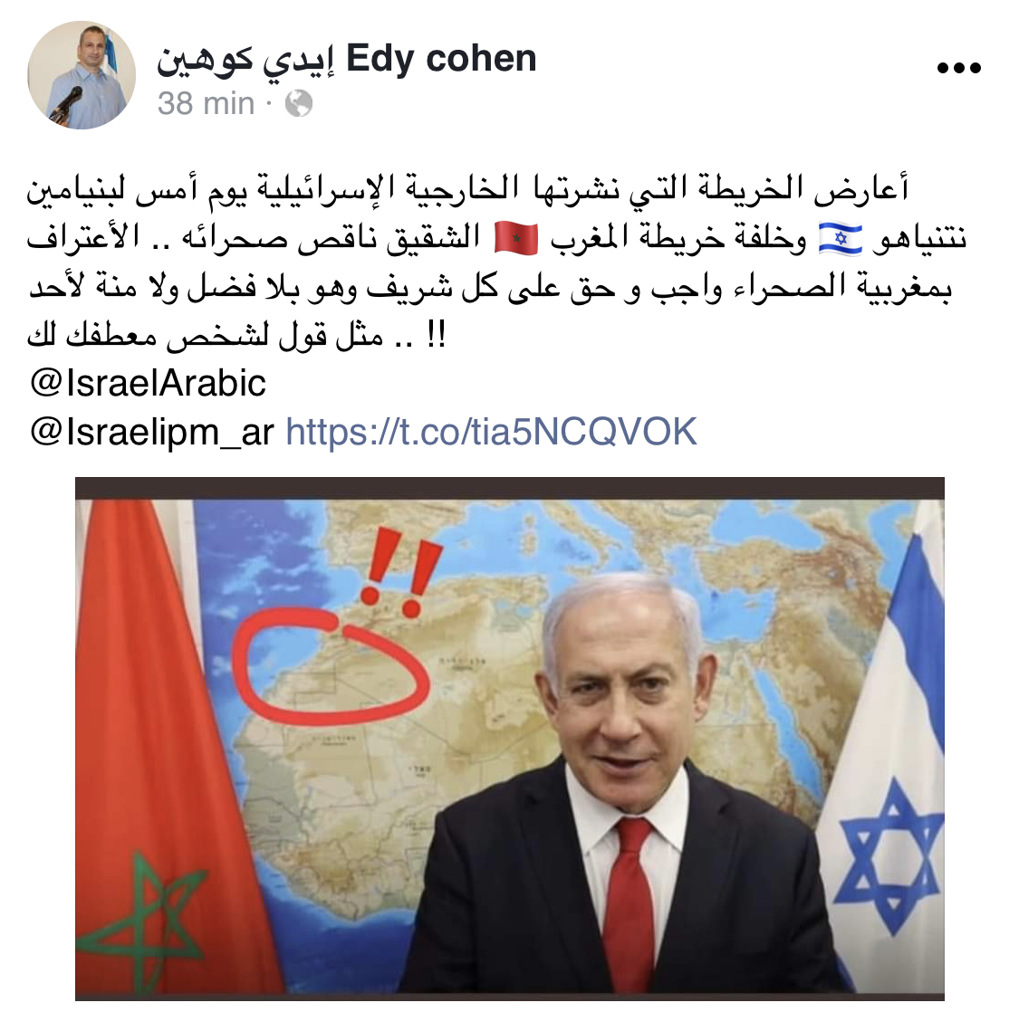 عبر الصحفي والأكاديمي الإسرائيلي، إيدي كوهين، عن رفضه التام لنشر خريطة المغرب دون صحرائه، وقال في تغريدة له مساء أمس الأحد على صفحته بموقع التواصل الاجتماعي فايسبوك، “أعارض الخريطة التي نشرتها الخارجية الإسرائيلية يوم أمس لبنيامين نتانياهو وخلفه خريطة المغرب الشقيق ناقص صحرائه”.