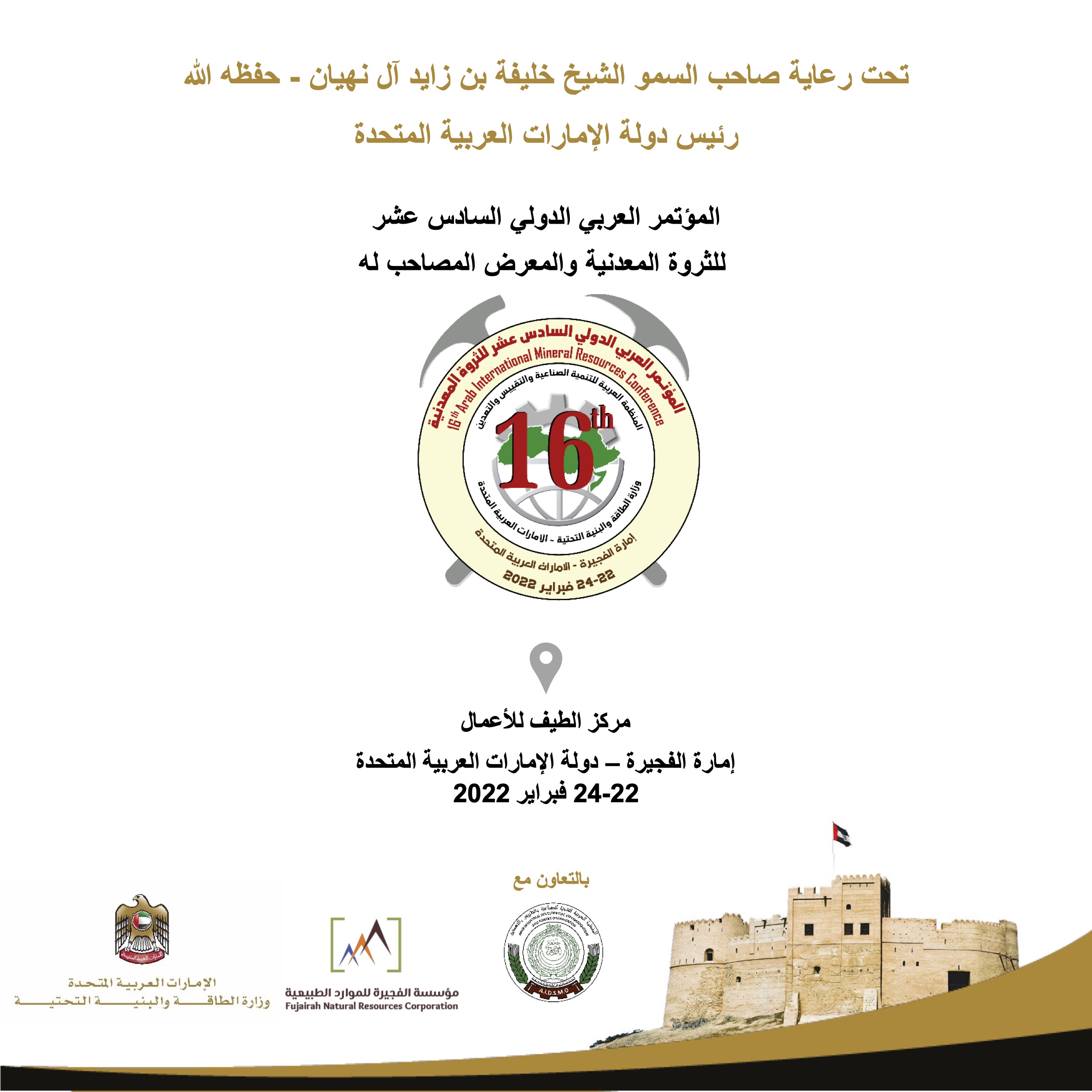 تستعد الفجيرة بدولة الإمارات العربية لاحتضان المؤتمر العربي الدولي للثروة المعدنية والمعرض المصاحب له في نسخته السادسة عشر، في الفترة 22-24 فبراير الجاري، برعاية كريمة لصاحب ألشيخ خليفة بن زايد آل نهيان رئيس الدولة، وبحضور صاحب السمو الشيخ حمد بن محمد الشرقي عضو المجلس الأعلى حاكم الفجيرة.