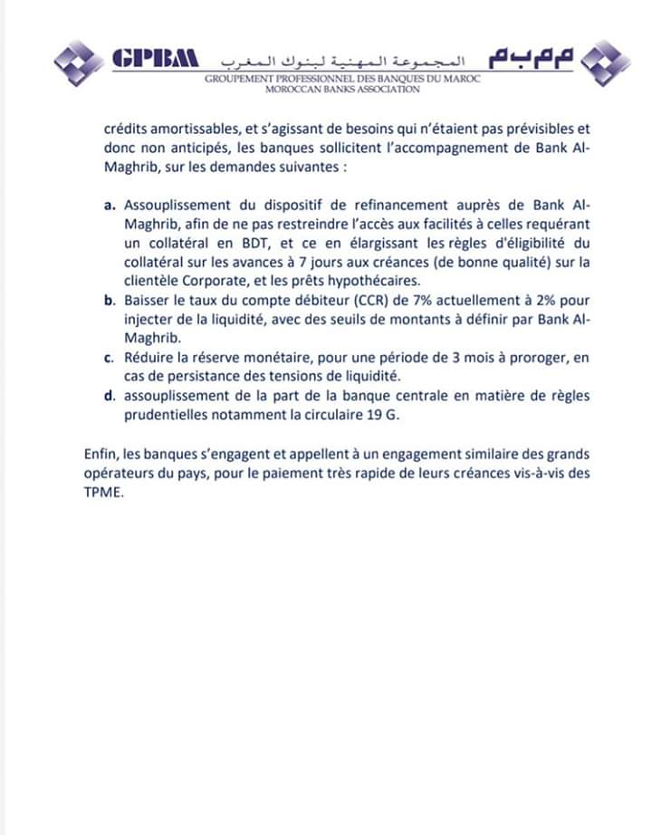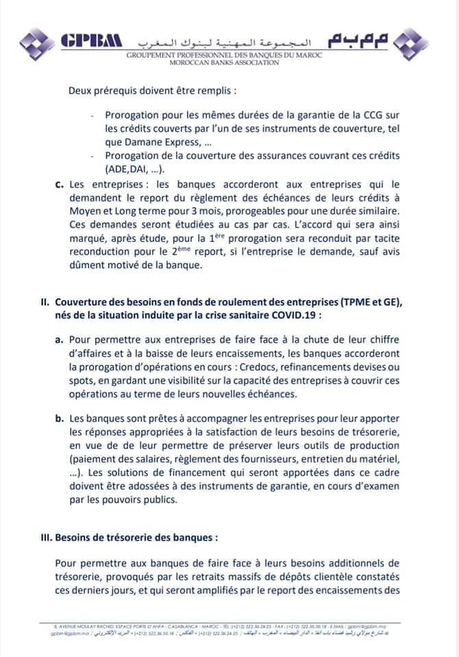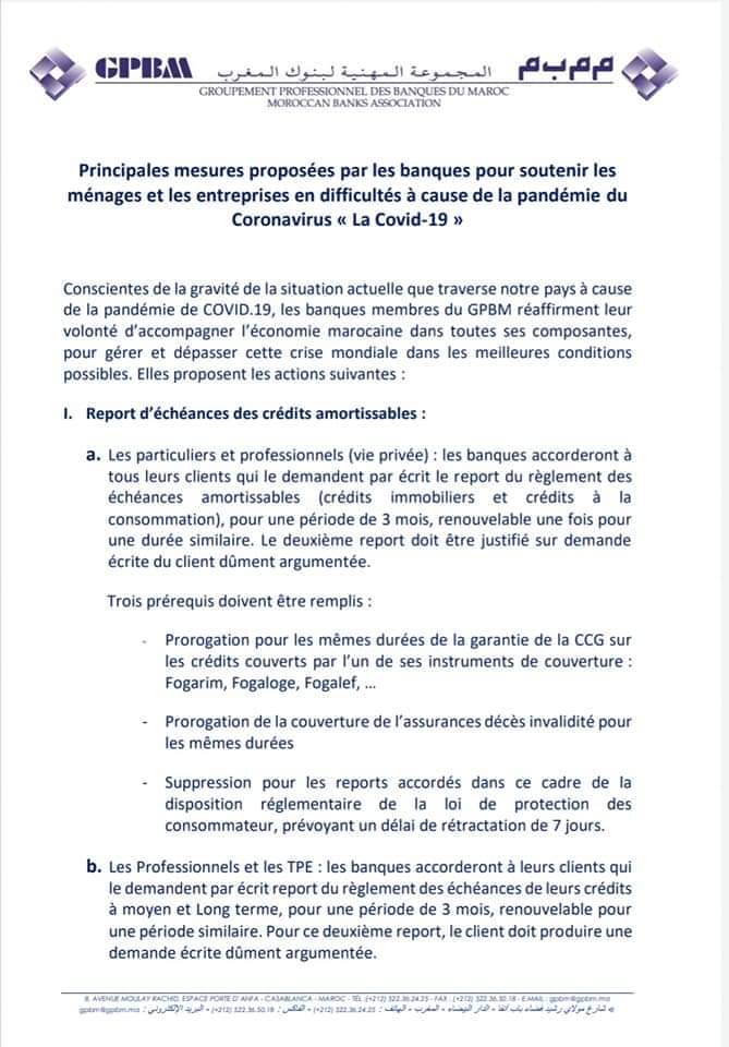 – امكانية بناء على طلبهم من تاجيل اقساط سلفات الاستهلاك و السكن لاشهر مارس، ابريل، ماي ويونيو. وان الاداء سيكون عند نهاية اخر قسط.