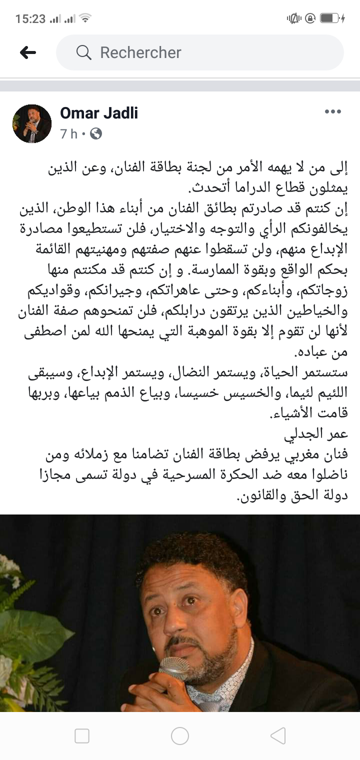 فنان مغربي يرفض بطاقة الفنان تضامنا مع زملائه ومن ناضلوا معه ضد الحكرة المسرحية ….انتهت التدوينة