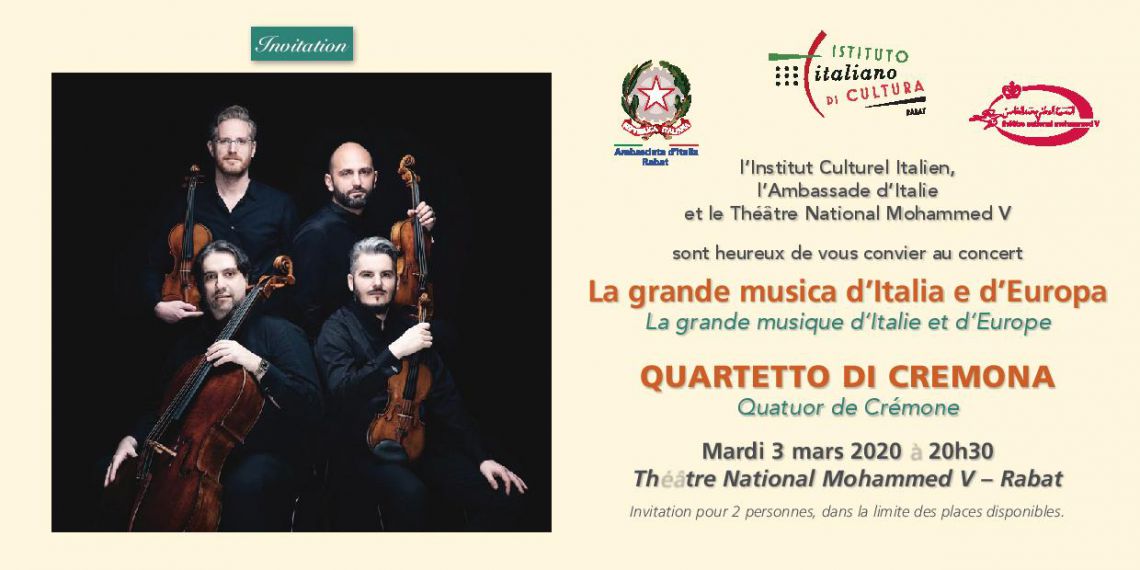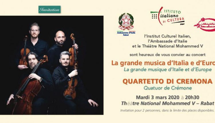 ينظم المعهد الثقافي الإيطالي بالرباط حفلا موسيقيا بعنوان “الموسيقى الرائعة لإيطاليا و أوروبا” ، للفرقة الرباعية كريمونا،وذلك يوم الثلاثاء 3 مارس المقبل، على الساعة 20:30 مساءا بمسرح محمد الخامس بالرباط.