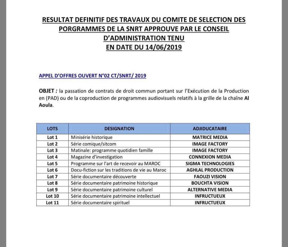 ورفقته ( الصورة رقم 1 ) تقرير المجلس الإداري الذي زكى هذه الرداءة الممولة من المال العام بميزانبة إجمالية تبلغ 500 مليون سنتيم لإنتاج عشر حلقات، في اجتماعه يوم 14 يونيو 2019 ، حيث تم الاعلان عن ” فوز ” شركة Aghlal Production بالصفقة المسجلة في الخانة ( LOT رقم 6 ) كما هو واضح في صورة التقرير . وفي الصورة الثانية ستلاحظون في الخانة السادسة ( Docu-Fiction ) رقم عدد حلقات البرنامج ومدة كل حلقة، والميزانية المخصصة لكل حلقة خارج الضريبة (H.T ) وهي 420 الف درهم .