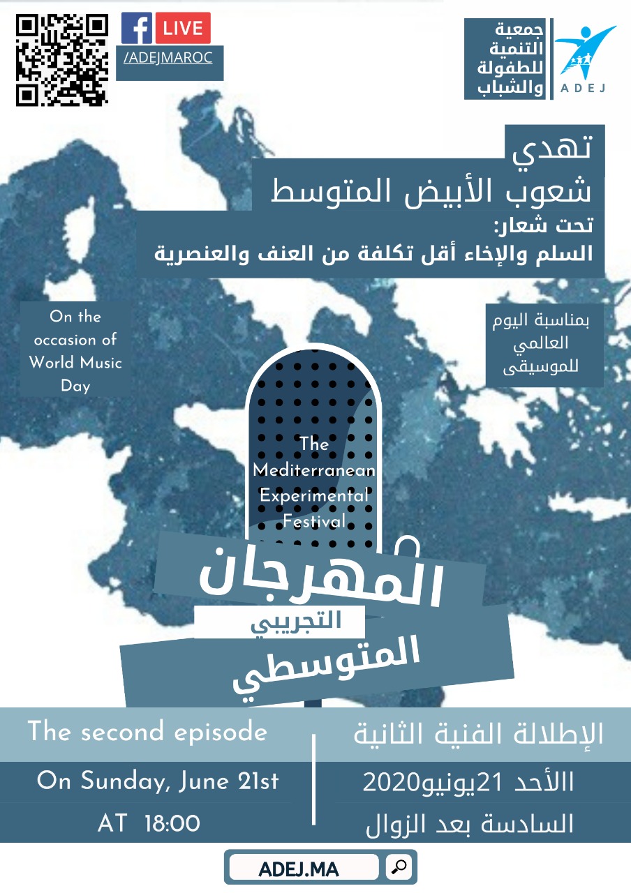 تحت شعار الاخاء و السلام أقل تكلفة من العنصرية و العنف، تنظم جمعية التنمية للطفولة و الشباب ADEJ ، المهرجان الثقافي الفني التجريبي المتوسطي عن بعد (الحلقة الثانية)، وذلك يوم الاحد 21 يونيو 2020 على الساعة السادسة بالتوقيت المغربي بمناسبة اليوم العالمي للموسيقى، و تأتي هذه التظاهرة الثقافية كفسحة فرح و محبة و تواصل إهداء من الجمعية و الفنانين المشاركين الى شعوب المنطقة و هم يخرجون من الحجر الصحي.