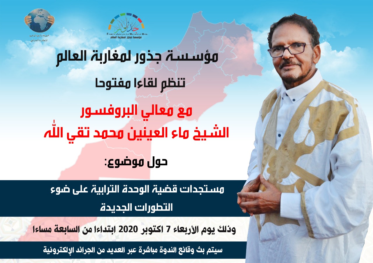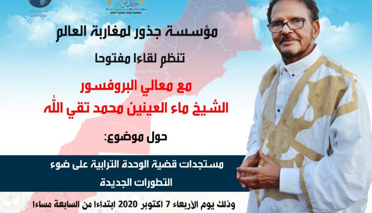 تنظم مؤسسة جذور لمغاربة العالم لقاء مع الشيخ ماء العينين محمد تقي الله حول مستجدات قضية الوحدة الترابية على ضوء التطورات الجديدة،وذلك يوم الأربعاء 7أكتوبر 2020انطلاقا من السابعة مساء