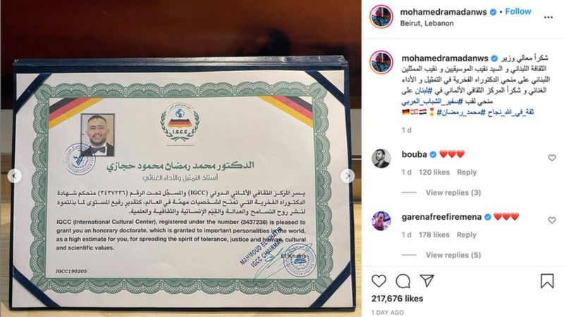 وتظهر الصور المتداولة “شهادة دكتوراه من المركز الثقافي الألماني الدولي في لبنان” بتاريخ 5 أغسطس، وأخرى لشهادة “سفير الشباب العربي” من نقابة المسرح والإذاعة والسينما ونقابة محترفي الموسيقى والغناء.