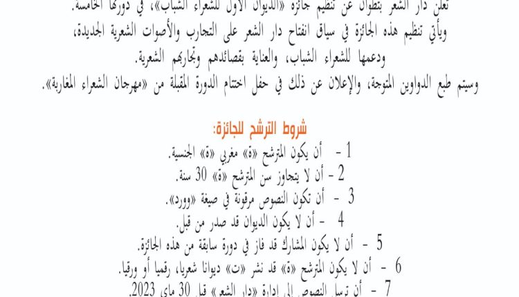 تعلن دار الشعر بتطوان عن تنظيم جائزة “الديوان الأول للشعراء الشباب”، في دورتها الخامسة.