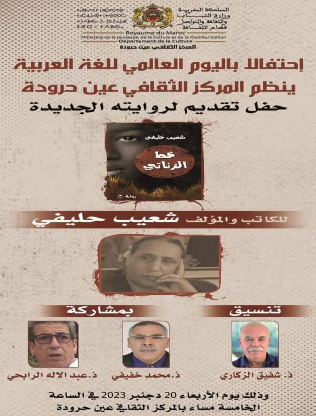 احتفالا باليوم العالمي للغة العربية ينظم المركز الثقافي بعين حرودة لقاءً ثقافيا مع شعيب حليفي وروايته الجديدة” خط الزناتي” ، وذلك يوم الأربعاء 20 دجنبر 2023 في الساعة الخامسة مساءً، بمشاركة الناقدين عبد الإله رابحي ومحمد خفيفي، وينسق أشغال هذا اللقاء شفيق الزكاري.