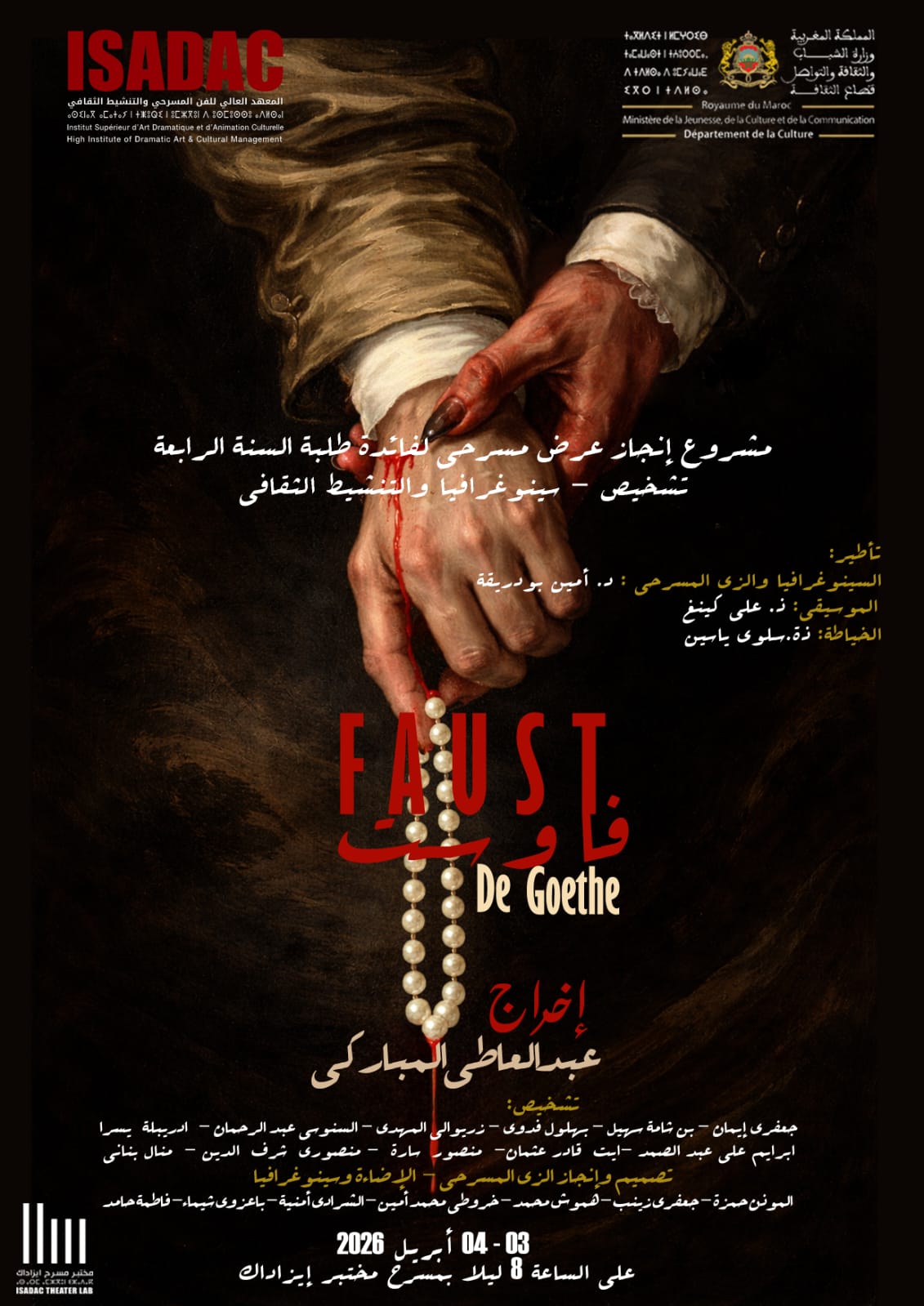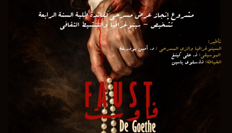 على الساعة 20h، عرض مسرحية فاوست الشهيرة من طرف طلبة السنة الرابعة تشخيص وسينوغرافيا وتنشيط ثقافي، من اخراج عبد العطي لمباركي.