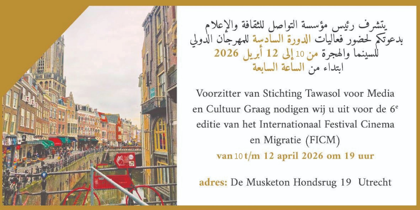 تنظم مؤسسة التواصل للثقافة والإعلام بهولندا الدورة السادسة للمهرجان الدولي للسينما والهجرة والذي سينعقد في الفترة ما بين 10 إلى 12 ابريل 2026 بمدينة أوتريخت.