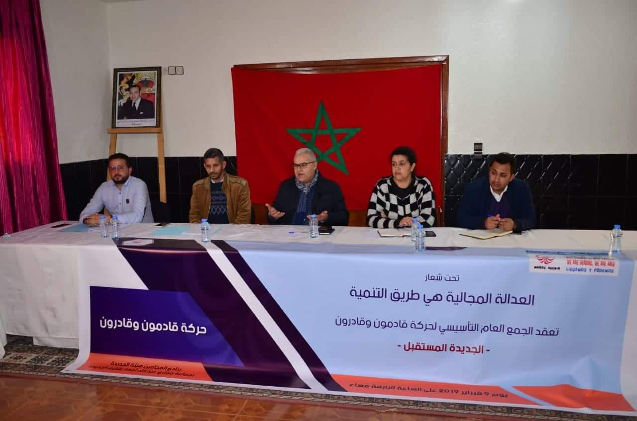 شهد نادي نقابة المحامين بجماعة مولاي عبد الله بإقليم الجديدة، مساء يوم السبت 9 فبراير 2019 لقاء تأسيسيا لحركة قادمون وقادرون – الجديدة المستقبل حضره المصطفى المريزق الرئيس الناطق الرسمي باسم الحركة، مصحوبا بعائشة العلوي المنتدبة الترابية للحركة بجهة الرباط سلا القنيطرة، وهشام حسنابي المنتدب الترابي لجهة بني ملال خنيفرة وثلة من قياديي الحركة من مناطق مختلفة.