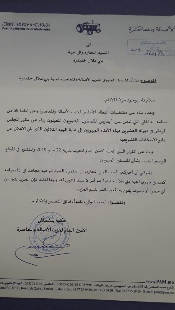 راسل الامين العام لحزب الأصالة والمعاصرة حكيم بنشماس والي جهة بني ملال-خنيفرة من اجل أخباره بتوقيف وتجميد الامين الجهوي لحزب الأصالة والمعاصرة بالجهة ابراهيم مجاهد..