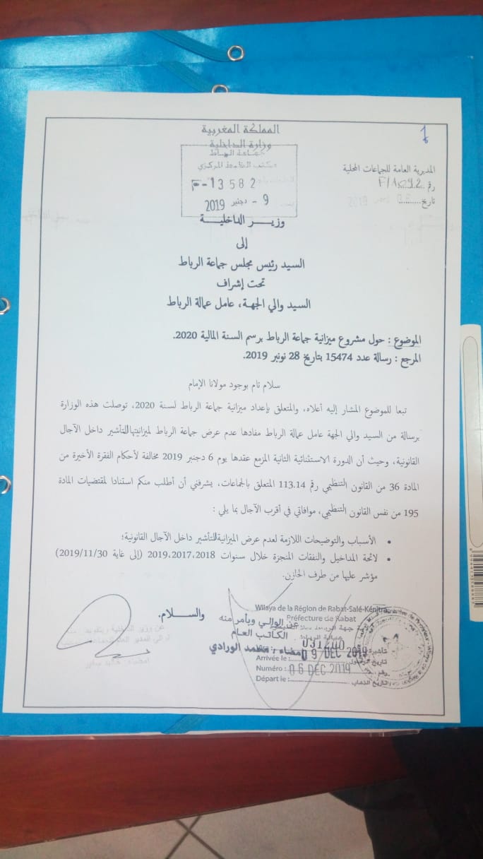راسلت وزارة الداخلية تحت اشراف والي جهة الرباط القنيطرة، راسلت عمدة مدينة الرباط المنتمي لحزب العدالة والتنمية محمد الصديقي، مطالبته بالكشف عن اسباب عدم احترام المقتضيات القانونية بخصوص تقديم مشروع ميزانية المجلس الجماعي للسنة المقبلة،