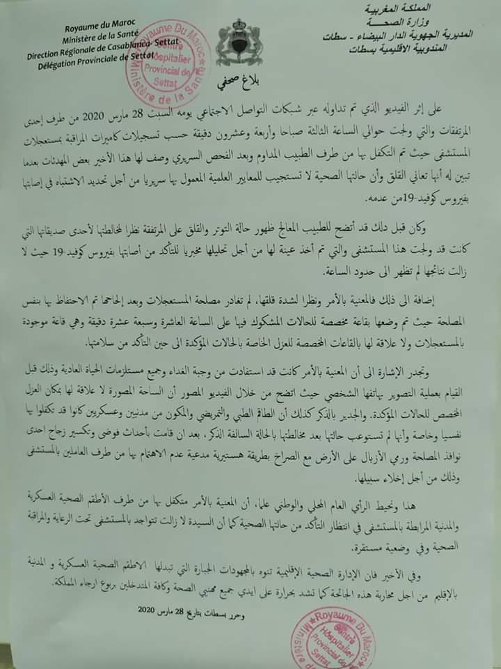 وقالت المندوبية الإقليمية للصحة باقليم سطات في بلاغها التوضيحي ان السيدة صاحبة الفيديو ولجت مستعجلات المستشفى الإقليمي وهي تشتكي من الإهمالوبعد مخالطتها احدى المصابات بالفيروس..