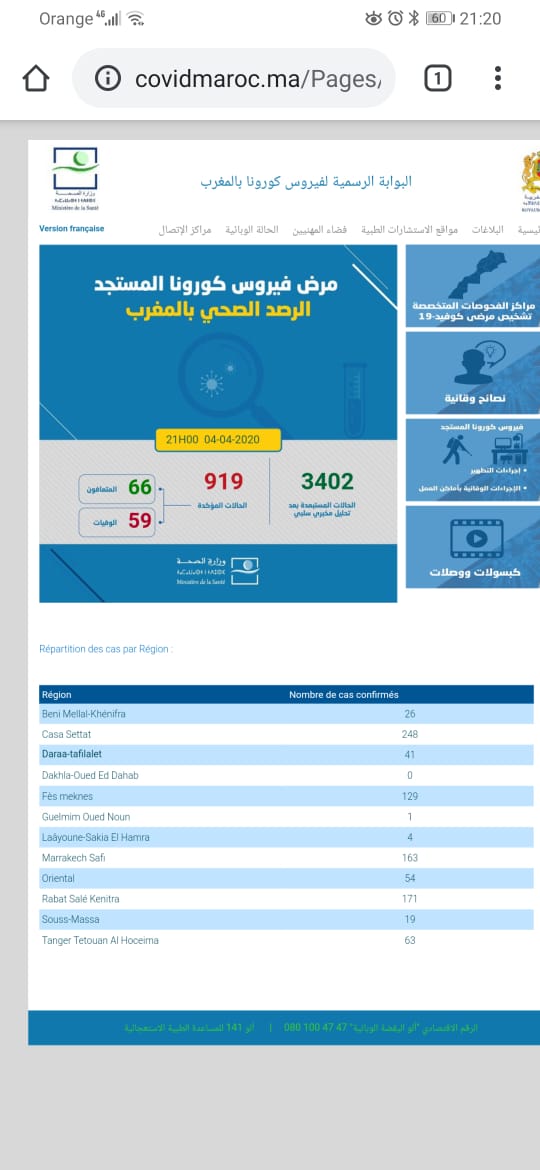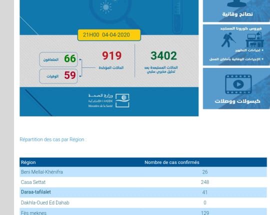 وأضافت الوزارة، على بوابتها الرسمية الخاصة بفيروس كورونا المستجد بالمغرب “www.covidmaroc.ma”، أن عدد الحالات التي تماثلت للشفاء من المرض حتى الآن بلغ 66 حالة، فيما بلغ عدد حالات الوفاة 59.